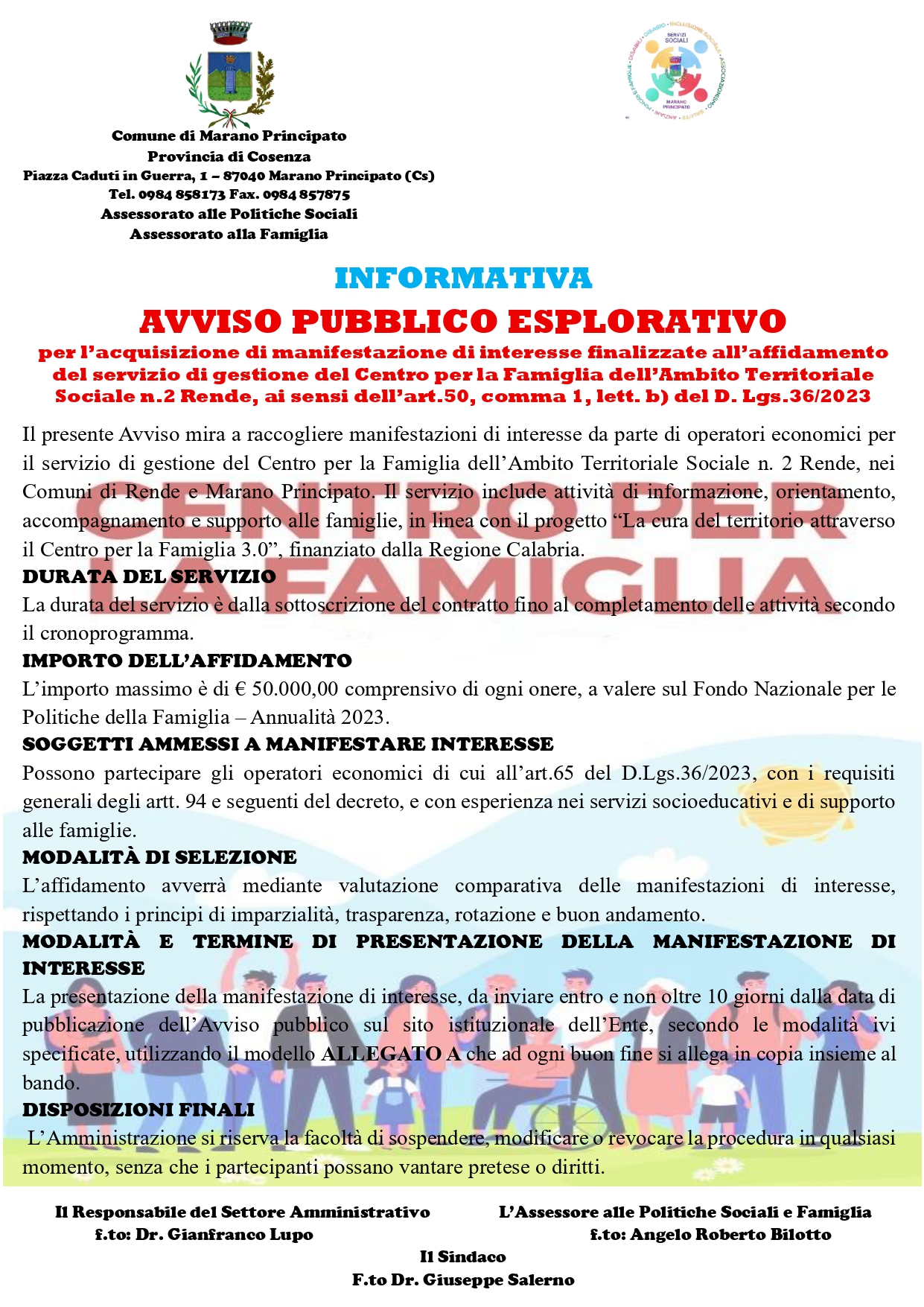 Acquisizione di manifestazioni di interesse finalizzate all’affidamento del servizio di gestione del Centro per la Famiglia dell’Ambito Territoriale Sociale n. 2 Rende, ai sensi dell’art. 50, comma 1, lett. b) del D.Lgs. 36/2023.