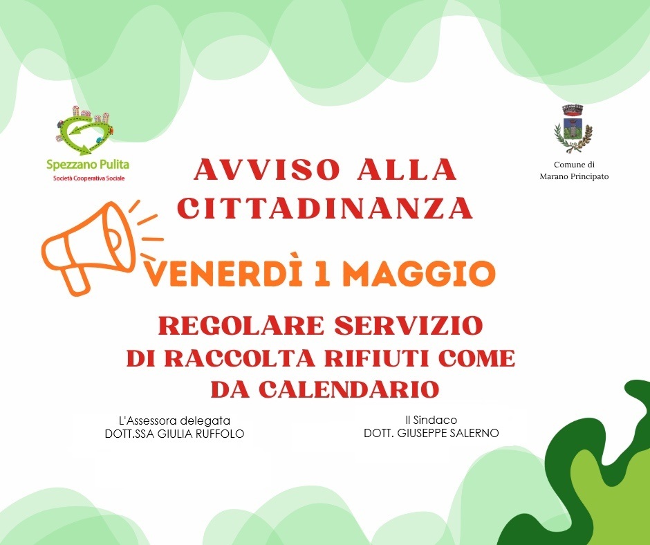 Si avvisa la cittadinanza che giorno venerdì 1 maggio il servizio raccolta rifiuti continuerà regolarmente come da calendario