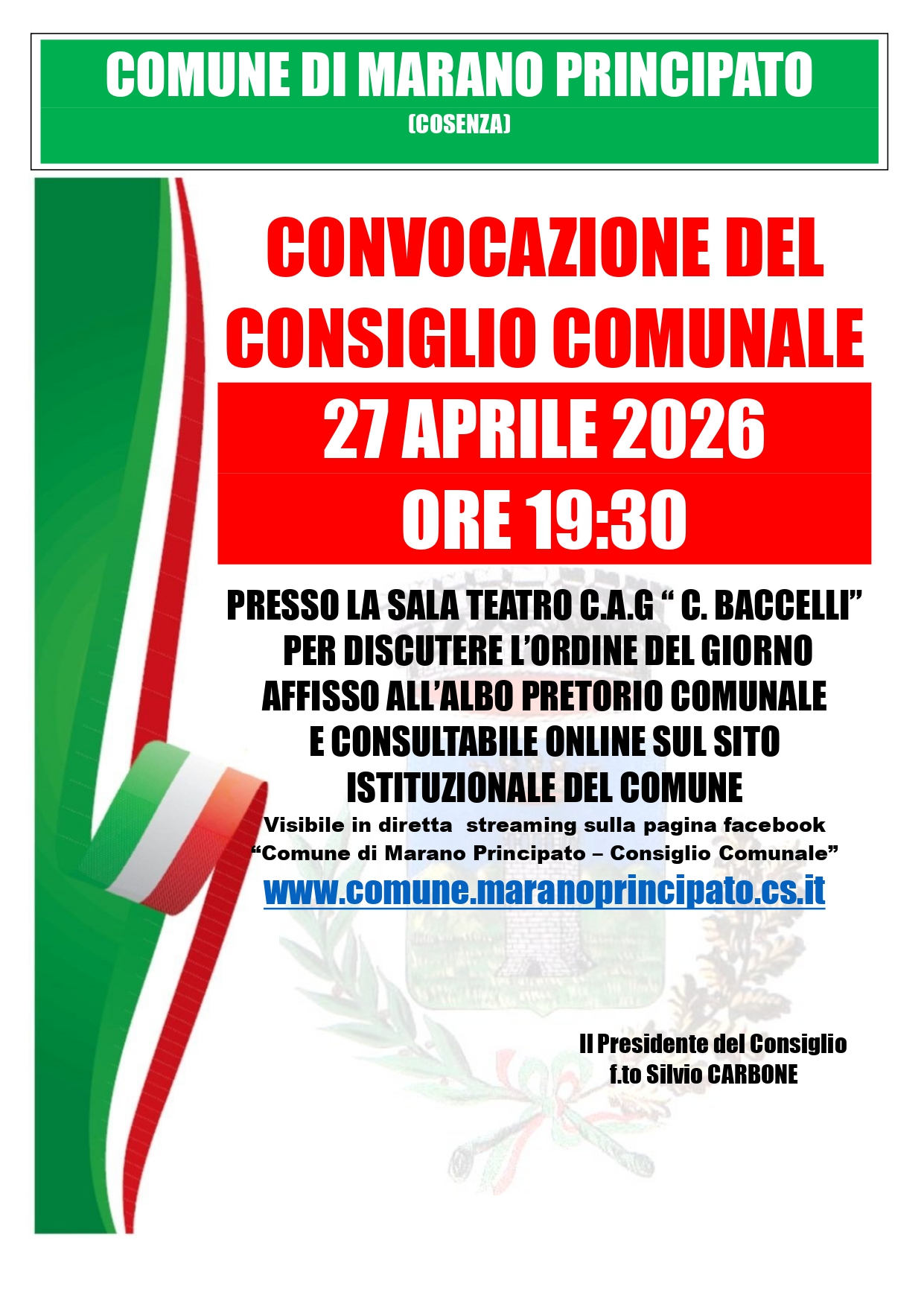 Convocazione del Consiglio Comunale per giorno 27 Aprile 2026 ore 19:30.