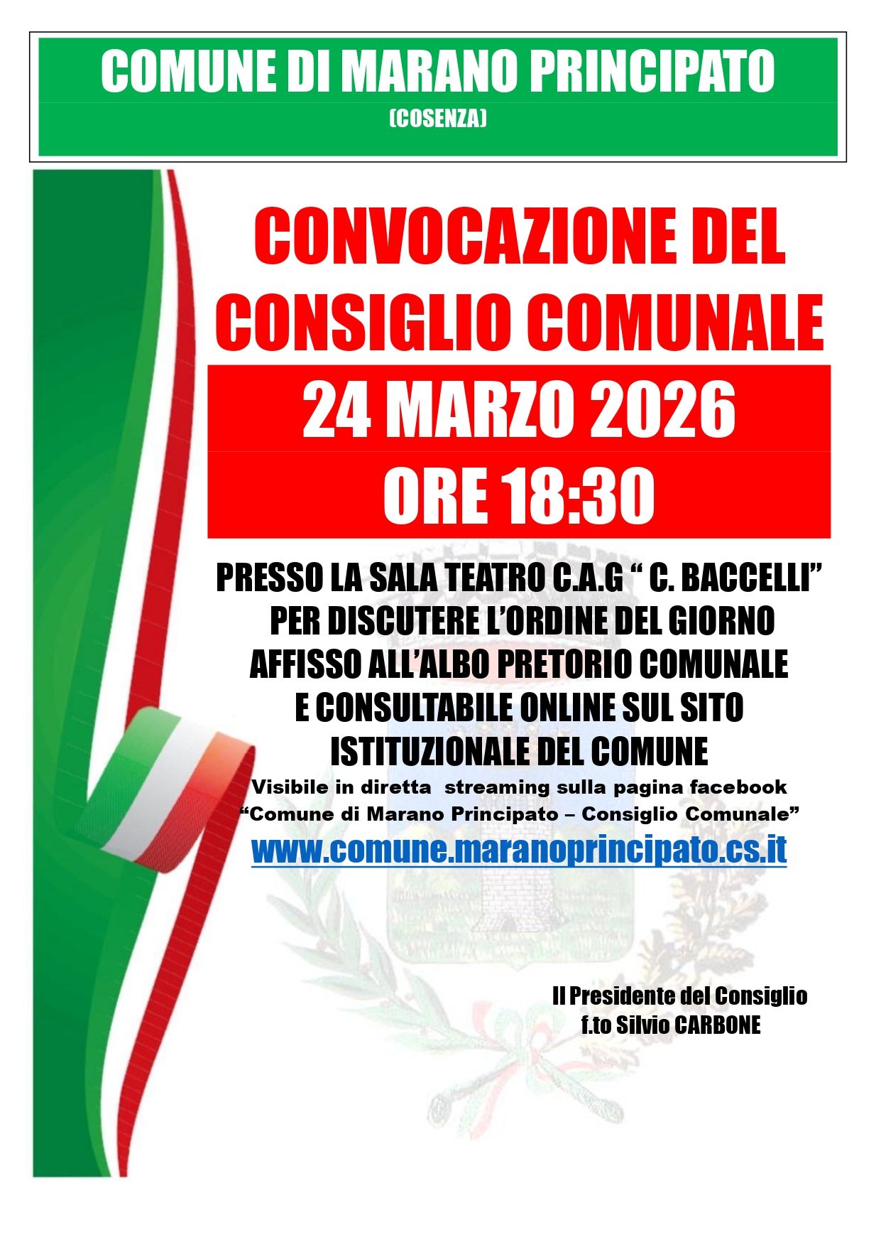 Convocazione del Consiglio Comunale per giorno 24 Marzo 2026 ore 18:30.