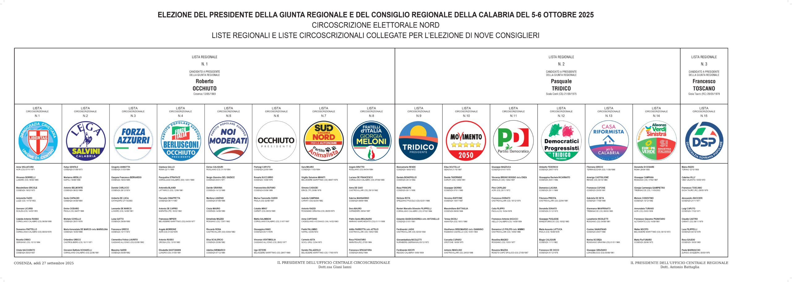 Elezioni Regionali del 5 e 6 Ottobre 2025, manifesto recante le candidature.