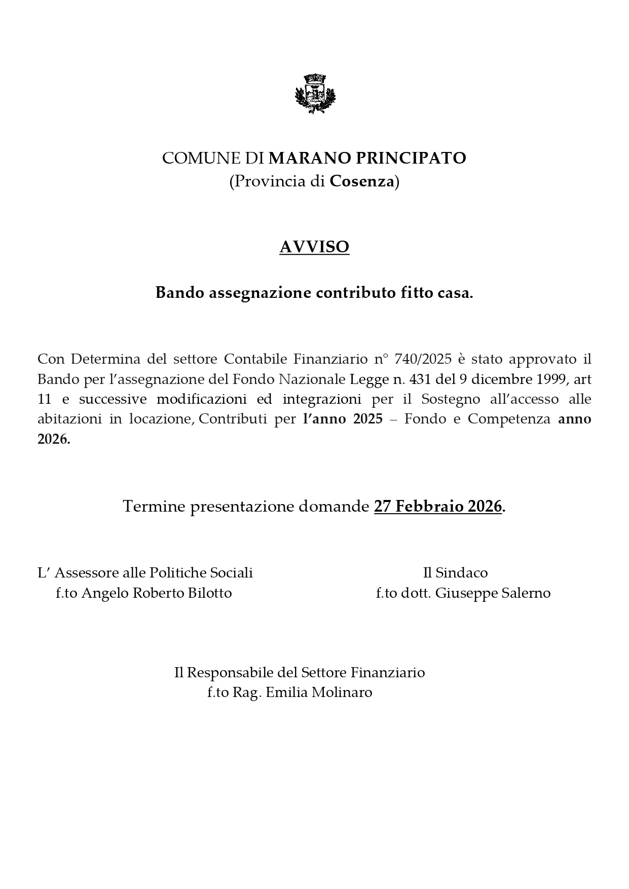 Bando assegnazione contributo fitto casa anno 2025. Termine presentazione domande 27 febbraio 2026.