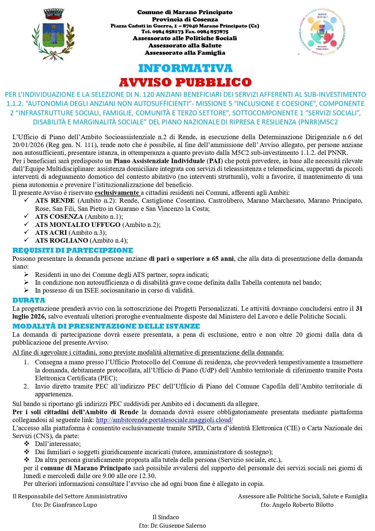 AVVISO PUBBLICO PER L’INDIVIDUAZIONE E LA SELEZIONE DI N. 120 ANZIANI BENEFICIARI DEI SERVIZI AFFERENTI SUB-INVESTIMENTO 1.1.2. “AUTONOMIA DEGLI ANZIANI NON AUTOSUFFICIENTI” - MISSIONE 5 “INCLUSIONE E COESIONE”.