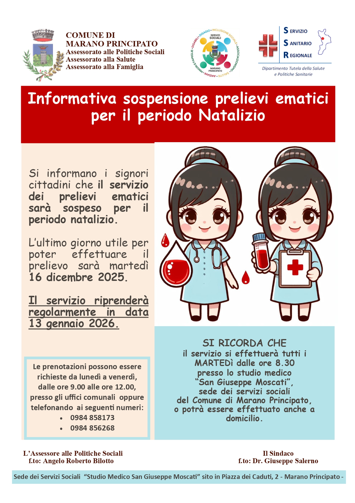 S'informano i signori cittadini che il servizio dei prelievi ematici sarà sospeso per il periodo Natalizio. L’ultimo giorno utile per poter effettuare il prelievo sarà martedì 16 dicembre 2025. Il servizio riprenderà regolarmente in data 13 gennaio 2026
