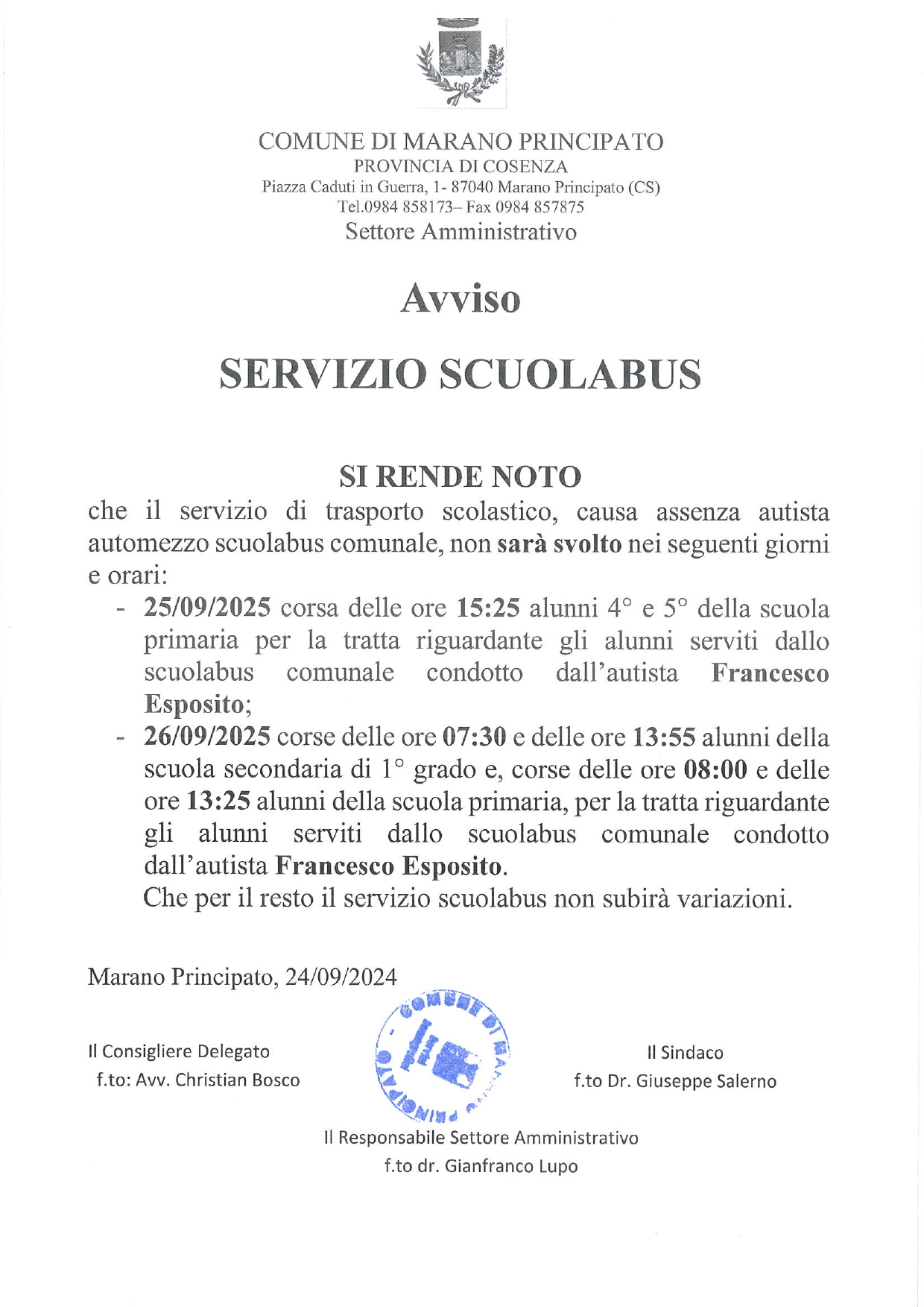 Avviso servizio scuolabus per il 25 e 26 settembre 2025.